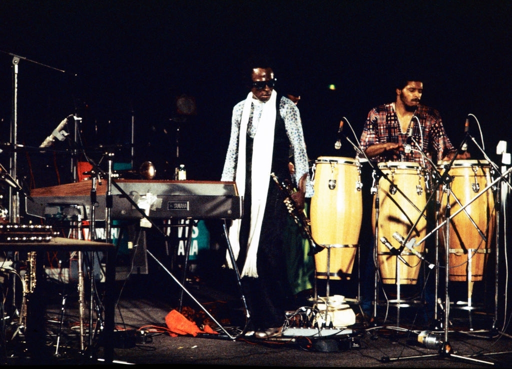 Captured in video footage loaded with hallucinatory jump cuts, the band builds toward a peak that crumbles into a brief “Tune in 5” as Pete Cosey punctuates the churning groove with a big assist from his Mu-Tron III envelope filter. Miles mercifully reduces things to a simmer before stepping behind the organ for a shaky “Ife” intro while Dave Liebman charts a dark course on flute that sets up a round of powerful solos from Miles, Cosey, and himself (on tenor) that form the set’s molten core. Video of this 13-minute stretch is astonishing. As if emerging from a trance, the septet stumbles into an “Untitled Original” that crests with a brutal bit of interplay between Reggie Lucas and Cosey until Miles begins deconstructing the jam with a momentum-killing series of stops and starts. A skeletal “Tune in 5” briefly re-emerges but quickly gives way to an extended conga outro from Mtume as the curtain falls.